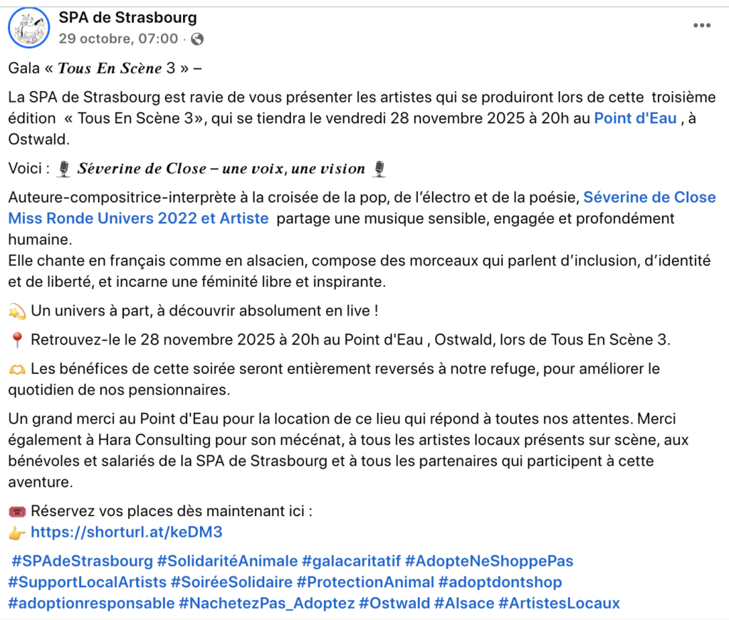 La SPA de Strasbourg est ravie de vous présenter les artistes qui se produiront lors de cette troisième édition « Tous En Scène 3», qui se tiendra le vendredi 28 novembre 2025 à 20h au Point d’Eau , à Ostwald.